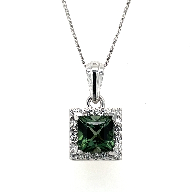 Back Princess Cut Green Tourmaline Halo Pendant with .23ct total weight Lab Grown Diamonds; set in 14k White Gold MSRP: $1,575 SKU: CSP233 Share on Twitter Share on PinterestShare on FacebookShare: Reserve in Store name email phonemessage Preferred Method of Contact email phone Reserve