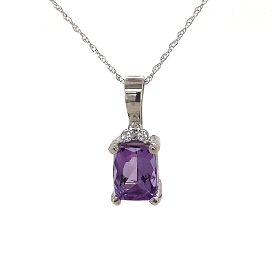 Back 8X6mm antique cushion cut amethyst set in 14k white gold pendant with .05ct total weight lab grown diamonds MSRP: $480 SKU: CSP253 Share on Twitter Share on PinterestShare on FacebookShare: Reserve in Store name email phonemessage Preferred Method of Contact email phone Reserve