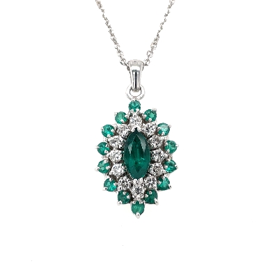Back Marquise emerald pendant; .60ct center emerald (A quality; medium color); .42ct tw diamond halo (SI2/G); .56ct tw emerald halo. 14k white gold MSRP: $2,625 SKU: CSP257 Share on Twitter Share on PinterestShare on FacebookShare: Reserve in Store name email phonemessage Preferred Method of Contact email phone Reserve
